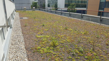 Nach dem Ausbau der Bestandsabdeckung aus Substrat, Speicher- und Drainageschichten, Abdichtung und Wärmedämmung wurde die bestehende Dampfsperre überarbeitet und anschließend der Dachaufbau mit PUR-Wärmedämmplatten und einer FPO-Folienabdichtung erneuert sowie Notüberläufe nachgerüstet. Zuletzt wurde die Dachbegrünung wiederhergestellt.